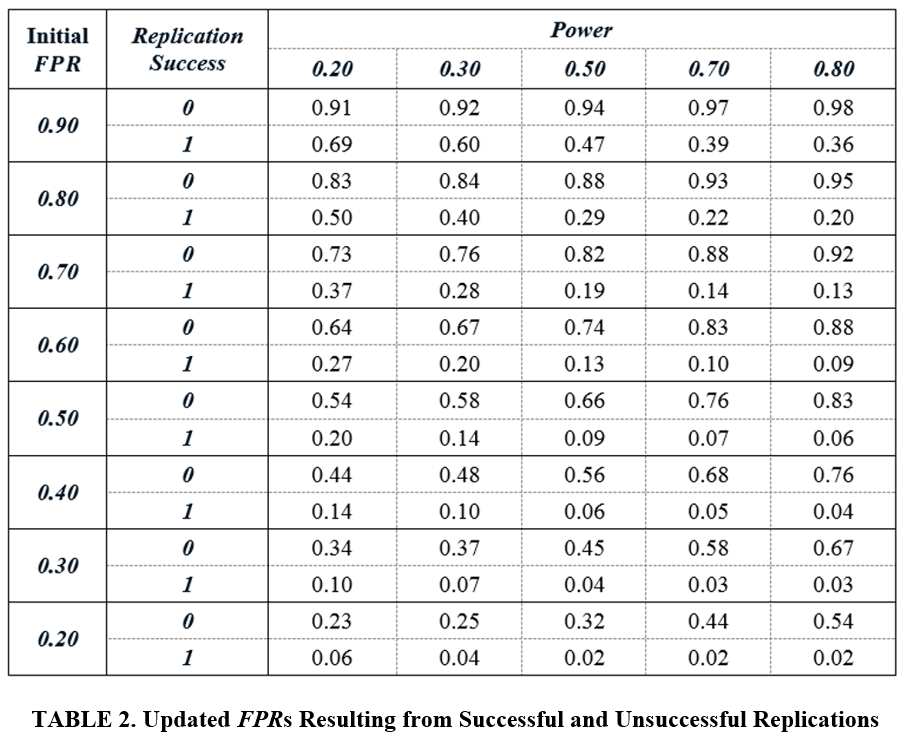 TABLE 2 demonstrates that successful replications produce substantial decreases in false positive rates across a wide range of initial FPRs and Power values. In other words, while discipline-wide measures of “success rates” may not be very informative, replications can have a powerful impact on the confidence that researchers attach to individual estimates in the literature.