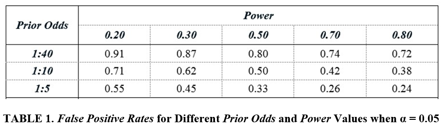 Define “Prior Odds” as the Prob(Treatment is effective):Prob(Treatment is ineffective). Define the “False Positive Rate” (FPR) as the percent of statistically significant estimates in published studies for which the true underlying effect is zero; i.e, the treatment has no effect. If the prior odds of a treatment being effective are relatively low, Type I error will generate a large number of “false” significant estimates that can overwhelm the significant estimates associated with effective treatments, causing the FPR to be high. TABLE 1 below illustrates this.