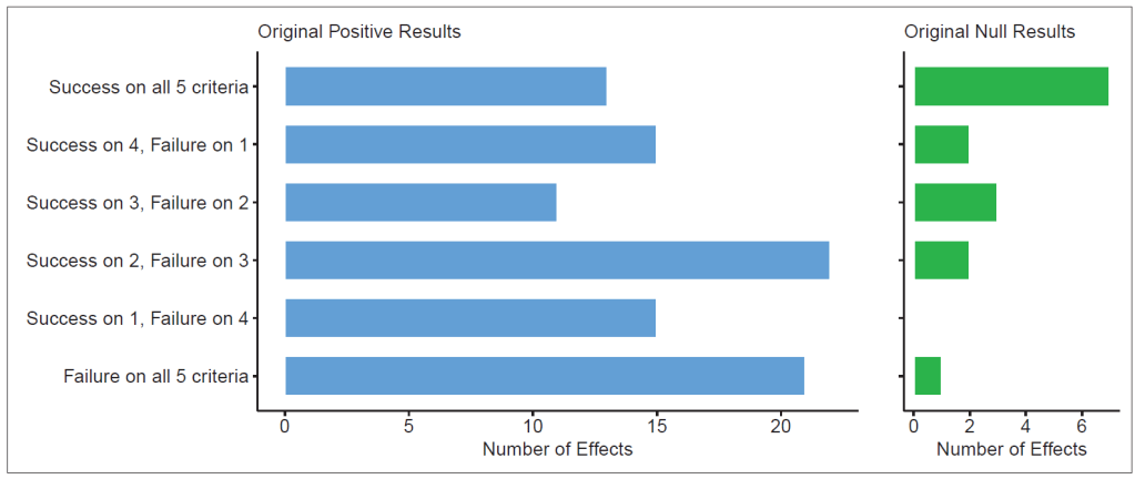“For original null effects, 7 of 15 (47%) replications succeeded on all five criteria, 2 succeeded on four, 3 succeeded on three, 0 failed on three, 2 failed on four, and 1 (7%) failed on all five.”