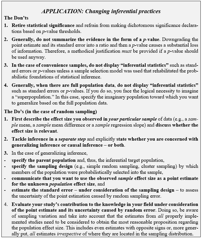 Peer-reviewed journals should be the gatekeepers of good scientific practice because they are key to what is publicly available as body of knowledge. Therefore, the most decisive statistical reform is to revise journal guidelines and include adequate inferential reporting standards. Around 2015, six prestigious economics journals (Econometrica, the American Economic Review, and the four AE Journals) adopted guidelines that require authors to refrain from using asterisks or other symbols to denote statistical significance. Instead, they are asked to report point estimates and standard errors. It seems that it would also make sense for other journals to reform their guidelines based on the understanding that the assumptions regarding random data generation must be met and that, if they are met, reporting point estimates and standard errors is a better summary of the evidence than p-values and statistical significance declarations. In particular, the Don’ts and Do’s listed in the box below should be communicated to authors and reviewers.