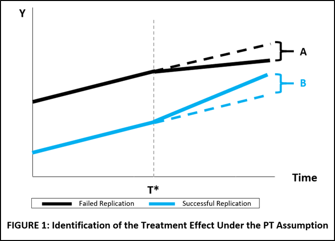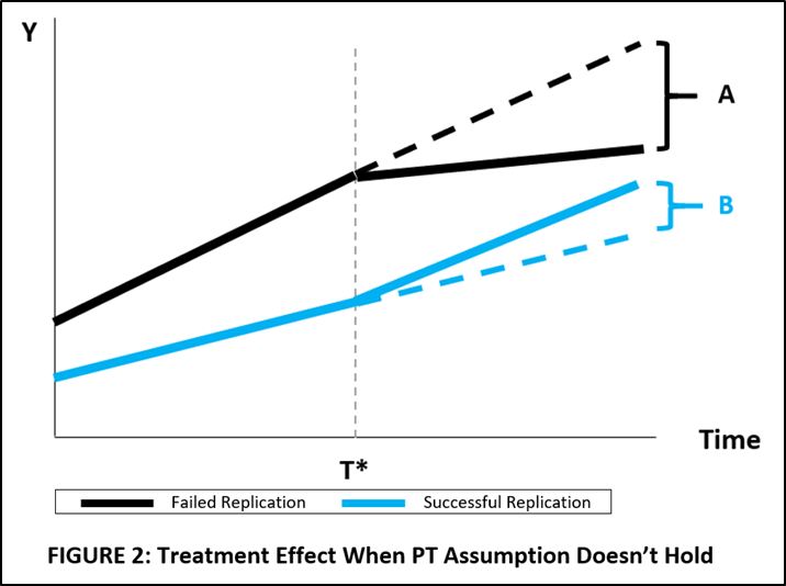 The importance of the PT assumption is illustrated in FIGURE 2. Here, originals with failed replications have a steeper trend in the pre-treatment period than originals with successful replications.