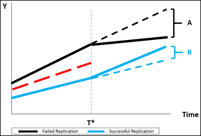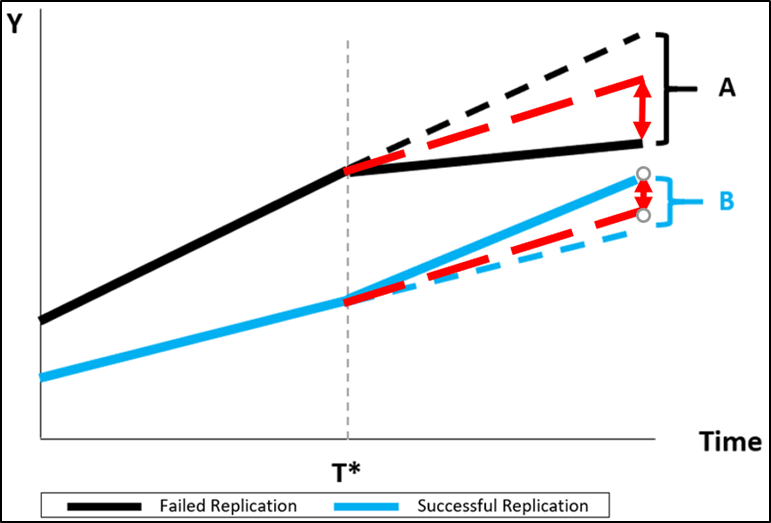 If the researcher were to mistakenly assume that they had the same trend, say use the average of the pre-treatment trends, they would underestimate both A and B, and thus underestimate the effect of a failed replication versus a successful replication.