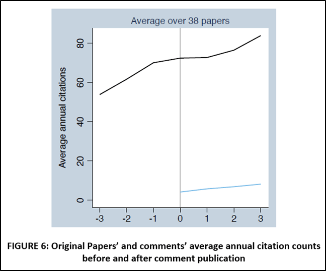 FIGURE 1 below shows trends in citations for studies that had failed replications (black line) and studies that had successful replications (blue line). The treatment is revelation of the outcome of the respective replications (failed replication, successful replication), and the start time of the treatment is the date that the replication was published, T*.