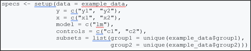 To illustrate the impact of specification choices on outcomes we use the specr R-package. To use specr, you indicate what are reasonable choices for your dependent variable, for your independent variable of interest, for your control variables, for your estimation model and for your sample restrictions. The general format is given below.