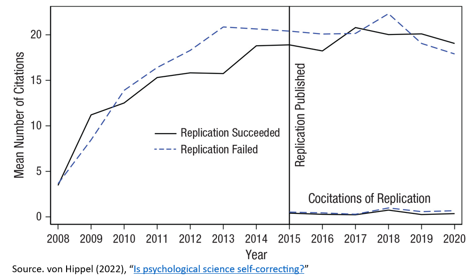 von Hippel, P. T. (2022). Is psychological science self-correcting? Citations before and after successful and failed replications. Perspectives on Psychological Science, 17(6), 1556-1565.